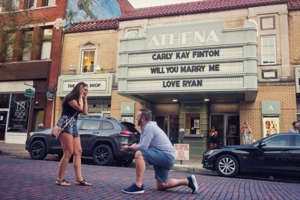 Put the question in lights! This is an especially good idea for movie lovers, but who wouldn’t want to walk up to a theater to see their name and “Will you marry me?” on the marquee? Another cute idea is to purchase an ad that plays on the screen before the movie.