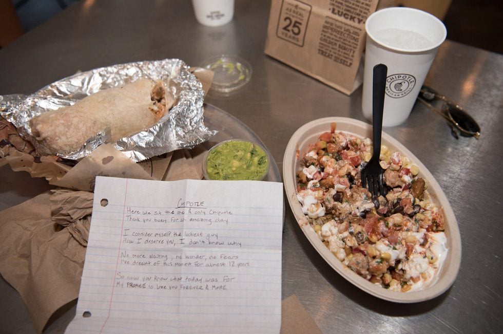 Chris Piwinski made the the decision to propose at the gourmet burrito chain after months of deliberation. He bought a ring back in January, but he just couldn’t decide on a place that was meaningful for both him and his longtime girlfriend, Natalie Neach. Then, in May, Chris made up his mind.