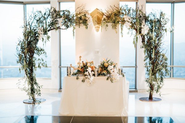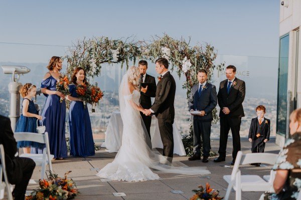 Event Venue:OUE Skyspace LA//Photographer:Monique Dao Photography//Event Planner: Samantha Rae Events//Floral Design:Tutta Bella Florist//Catering:LA Spice//Cake:The Butter End//Drinks:Paradise Bar Events//DJ:VOX DJs//Makeup Artist and Hair Styling:Lola + Liv MUA//Rings:Demarge//Wedding Dress Designer:La Sposa//Rentals:Bright Event Rentals//Glass Artist for Unity Ceremony Vase:Unity in Glass