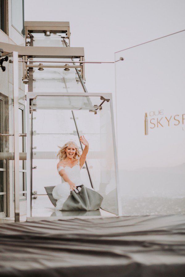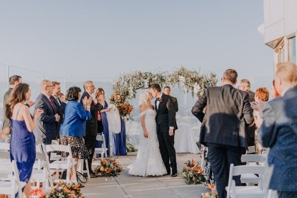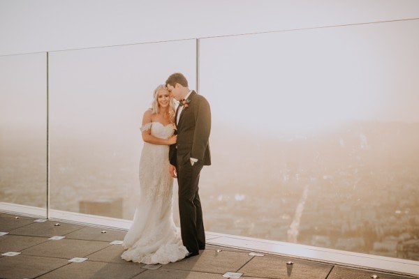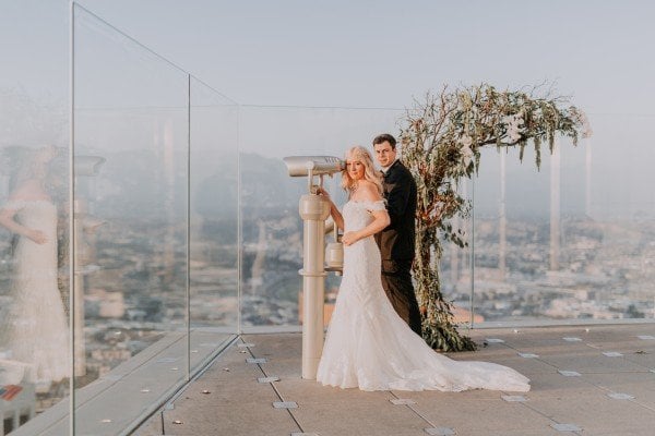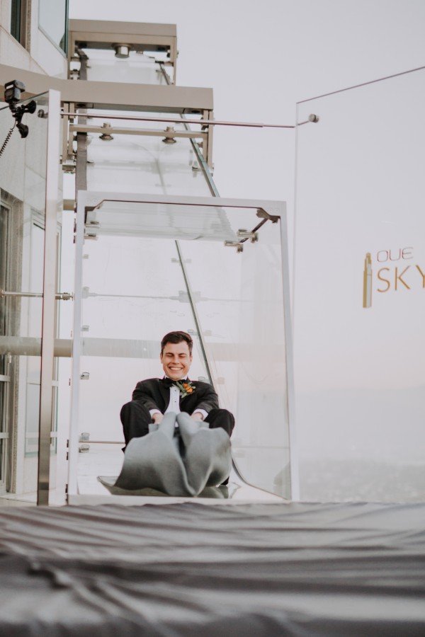 Jordan and Heather took their wedding to a whole ‘nother level — literally. In June, the couple said their “I Do’s” at OUE Skyspace Los Angeles’ observation deck, which has one of the city’s highest vantage points. If the 360-degree views of LA weren’t cool enough, what the newlywed couple did after the ceremony definitely is: a celebratory ride on the all-glass “Skyslide,” suspended 1,000 feet above the city.