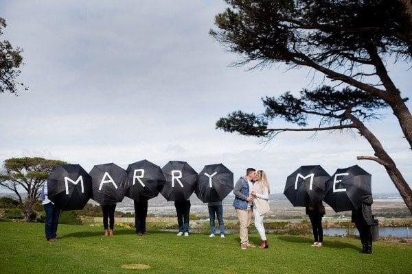 Having a group of friends and family spell out “Will you marry me?” is a lot cuter on umbrellas than posters. Plus, they can hide behind them while you’re approaching so the surprise isn’t ruined!