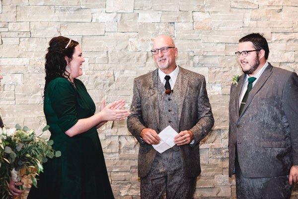 The day started out with hot and humid weather, with the chance of rain. It was dry until the ceremony when all of a sudden…downpour!!! Danyele walked out to the sound of thunder, grinning from ear to ear. Everyone ended up running inside laughing and we had the ceremony in the reception area, a little drenched but laughing and loving it! Come to find out, Ethan and Danyele share a love for rain and they were thrilled it rained on the wedding day, calling it serendipity! It rained on their first date, it rained on the day Ethan proposed, and it seemed to fit that it rained on their wedding day. too. I’ve never seen a happier (and more soaked) couple laughing and running around in puddles.”