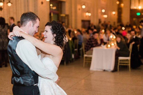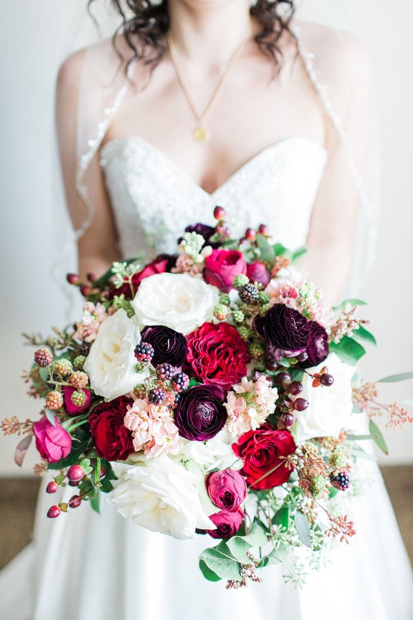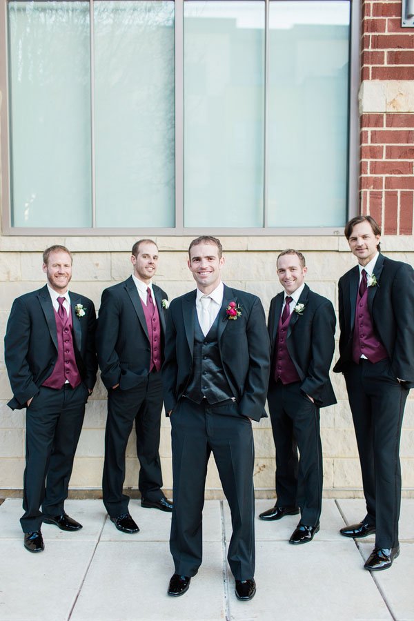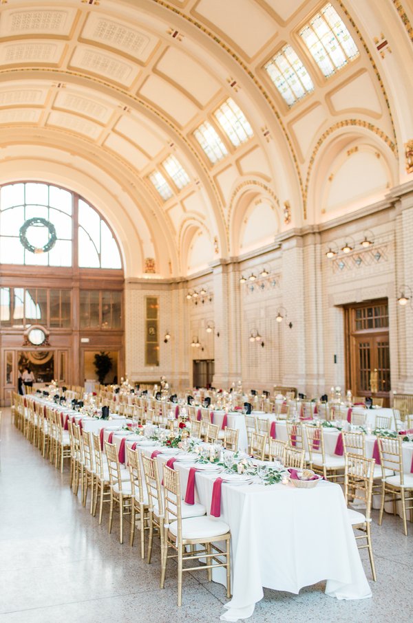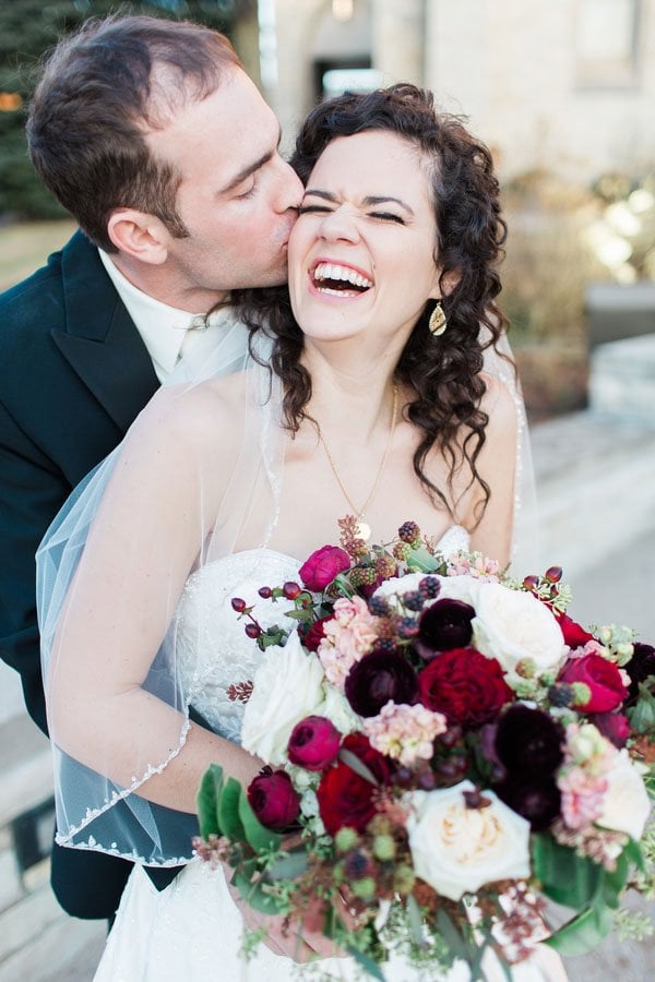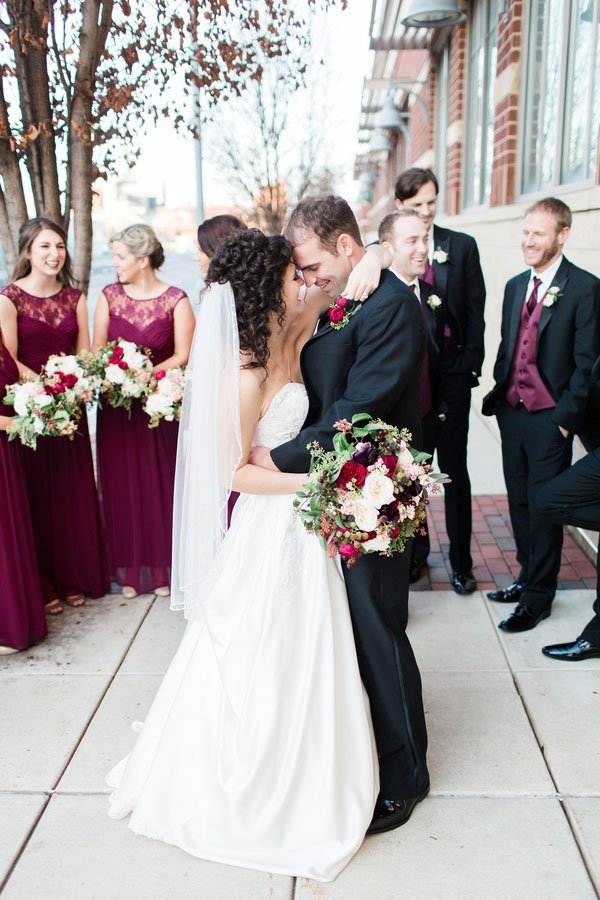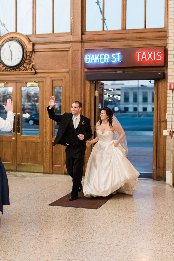 We’re a little hot right now in Southern California, so we wanted to cool down a bit with this January real wedding from Arielle Peters Photography. Despite frigid temps, Konny and Casey brought so much warmth to the streets of Fort Wayne, Indiana. With a Starbucks run and their first kiss while “flying the W” (I think it’s really cute how they stole that moment of privacy with the flag!), this couple’s wedding reflected who they were down to the smallest details! Even their choice of venue, the Baker Street Station, spoke for itself! With tall, arched ceilings, white brick walls, and speckled tiles, their gorgeous pink and plum colors really popped. It’s already making us feel cozy. 🙂