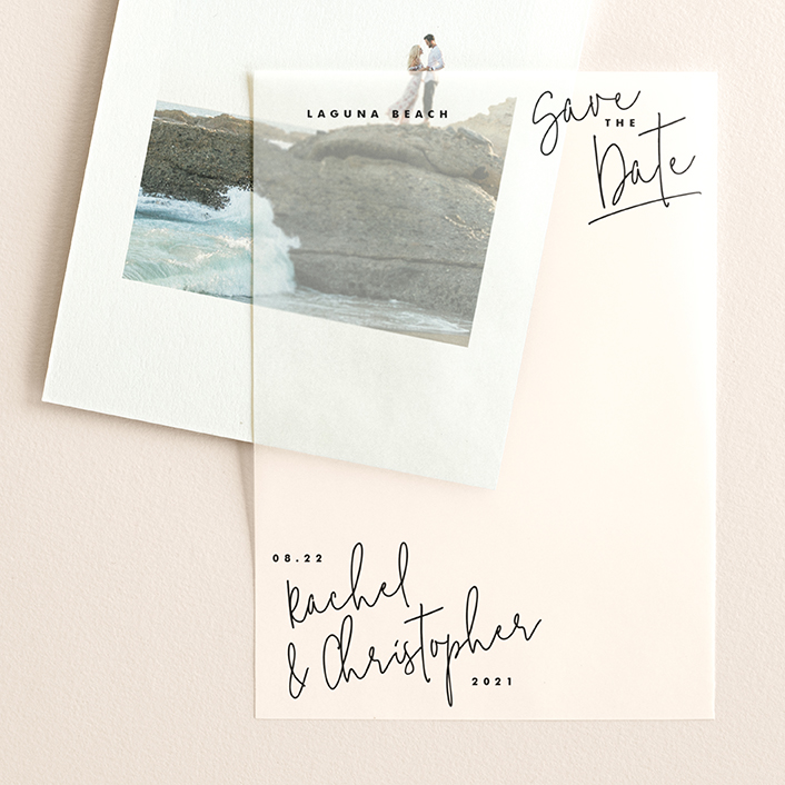 A luxe, translucent vellum overlay certainly adds a rich, glamorous layer to your invitation suite. Something so simple adds an experience to the invitation-opening for your guests, and provides a bit of mystery as to what details lay beneath. With Minted, you can customize your overlay to include an image or custom text (put those engagement photos to good use!) , or choose from their unique designs that include feature various fonts and phrases.