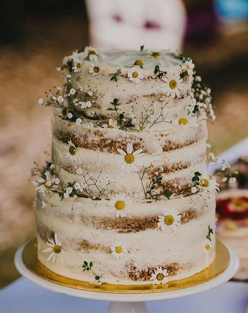 A rustic wedding cake is usually a naked or semi-naked cake. These cakes have only frosting between the layers (a true naked cake) or a light, sheer layer of frosting on the outside, letting the cake layers show through (the more popular semi-naked cake). However, it can also be fully covered, with fresh fruits, lace, burlap, flowers, leaves, or other wood-inspired elements taking center stage.